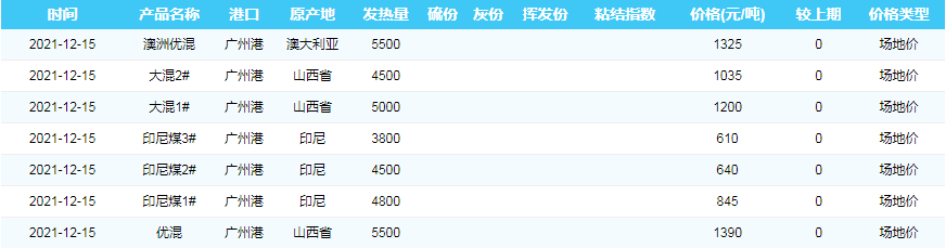 2021年12月15日广州港煤炭价格