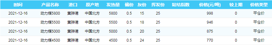 2021年12月16日黄骅港煤炭价格