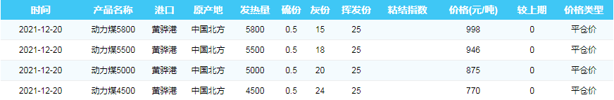 2021年12月20日黄骅港煤炭价格