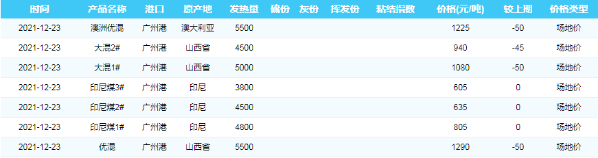 2021年12月23日广州港煤炭价格