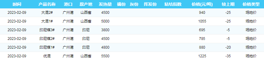 2023年2月9日广州港煤炭价格