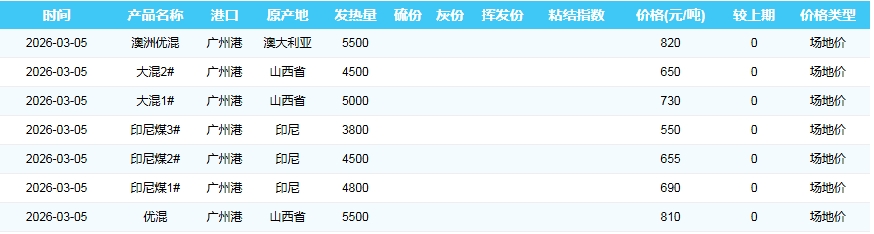 2026年3月5日广州港煤炭价格