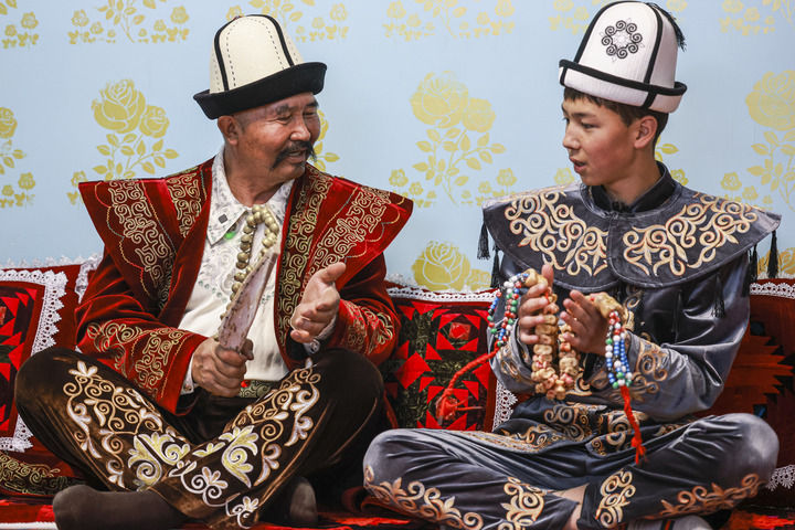 《玛纳斯》国家级非物质文化遗产代表性传承人江努日·图日干巴依(左)教徒弟演唱《玛纳斯》(2025年4月21日摄)。