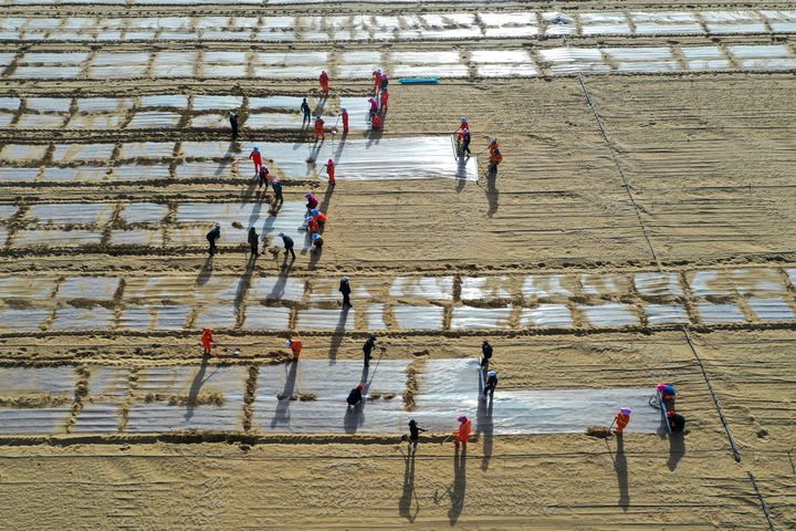 在新疆和田地区于田县沙产业实验基地,当地群众在种植薏米(2025年4月8日摄)。