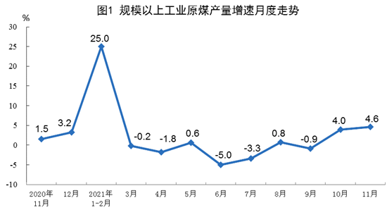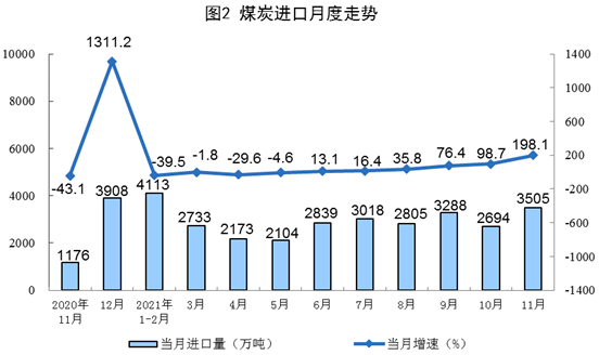 1—11月份,生产原煤36.7亿吨,同比增长4.2%,比2019年同期增长4.6%,两年平均增长2.3%;进口煤炭2.9亿吨,同比增长10.6%。