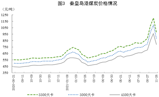 11月26日,秦皇岛港5500大卡、5000大卡和4500大卡动力煤综合交易价格分别为每吨986元、891元和792元,比10月29日分别回落216元、205元和169元。