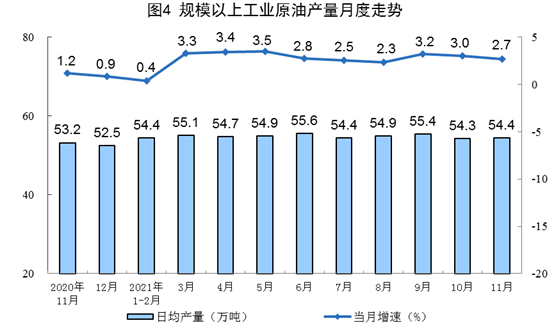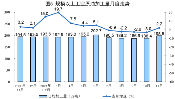 原油生产基本平稳,加工量由降转增。11月份,生产原油1631万吨,同比增长2.7%,增速比上月放缓0.3个百分点,比2019年同期增长3.9%,两年平均增长1.9%,日均产量54.4万吨;加工原油5964万吨,同比增长2.2%,增速由负转正,上月为下降3.0%,比2019年同期增长5.5%,两年平均增长2.7%,日均加工198.8万吨。