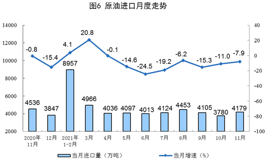 1—11月份,生产原油18248万吨,同比增长2.5%,比2019年同期增长4.2%,两年平均增长2.1%;加工原油64479万吨,同比增长4.9%,比2019年同期增长8.2%,两年平均增长4.0%。