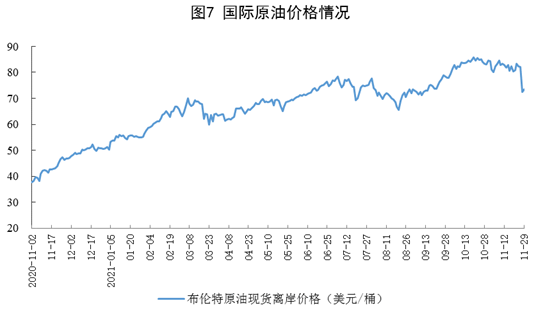 原油进口降幅收窄,国际原油价格下跌。11月份,进口原油4179万吨,同比下降7.9%,降幅比上月收窄3.1个百分点;1—11月份,进口原油46684万吨,同比下降7.3%。11月29日,布伦特原油现货离岸价格为73.3美元/桶,比10月29日下跌11.7%。
