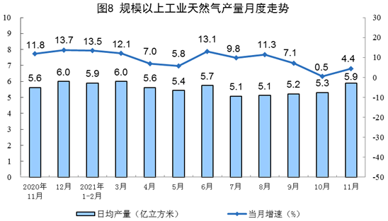 天然气生产加快。11月份,生产天然气177亿立方米,同比增长4.4%,增速比上月加快3.9个百分点,比2019年同期增长16.7%,两年平均增长8.0%,日均产量5.9亿立方米。
