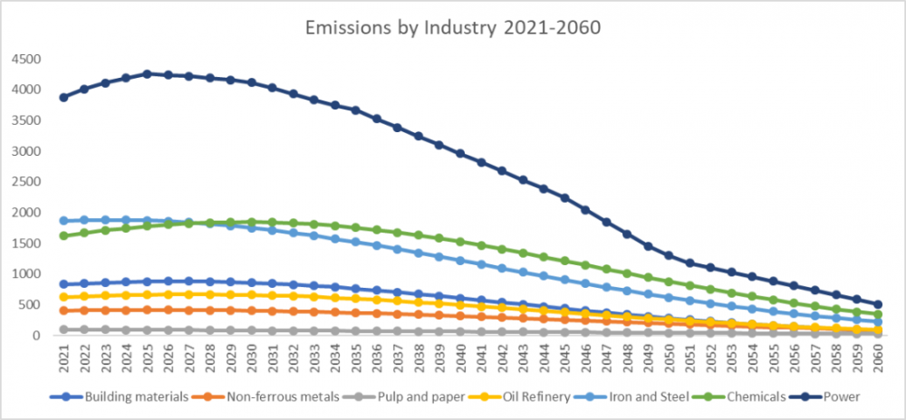 图1. 2021-2060 年按行业划分的碳排放量(百万吨)