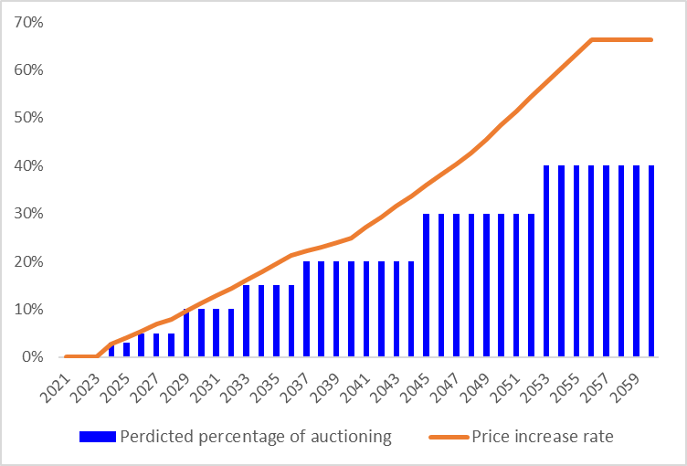 根据我们模型预测,中国碳排放交易体系将在明年(2024年)引入拍卖,初期为3%左右,到2060年逐渐增加至40%左右。拍卖机制将是推动市场化减排的关键一步。为了避免价格的突然变化,我们使用移动平均法计算拍卖对碳价的影响: