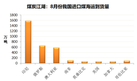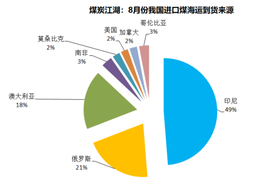 据煤炭江湖独家统计数据显示,8月份我国进口煤海运到货量累计为3250万吨。其中印尼煤到货量1584万吨,合计283艘船,占比为48.7%;煤炭江湖独家统计俄罗斯煤到货量662.6万吨,合计135艘船,占比为20.4%;煤炭江湖独家统计澳大利亚煤到货量581万吨,合计74艘船,占比为17.9%。煤炭江湖独家统计其余还有来自南非、莫桑比克、美国等地区的进口煤炭到货,但与前三者存在明显差距。