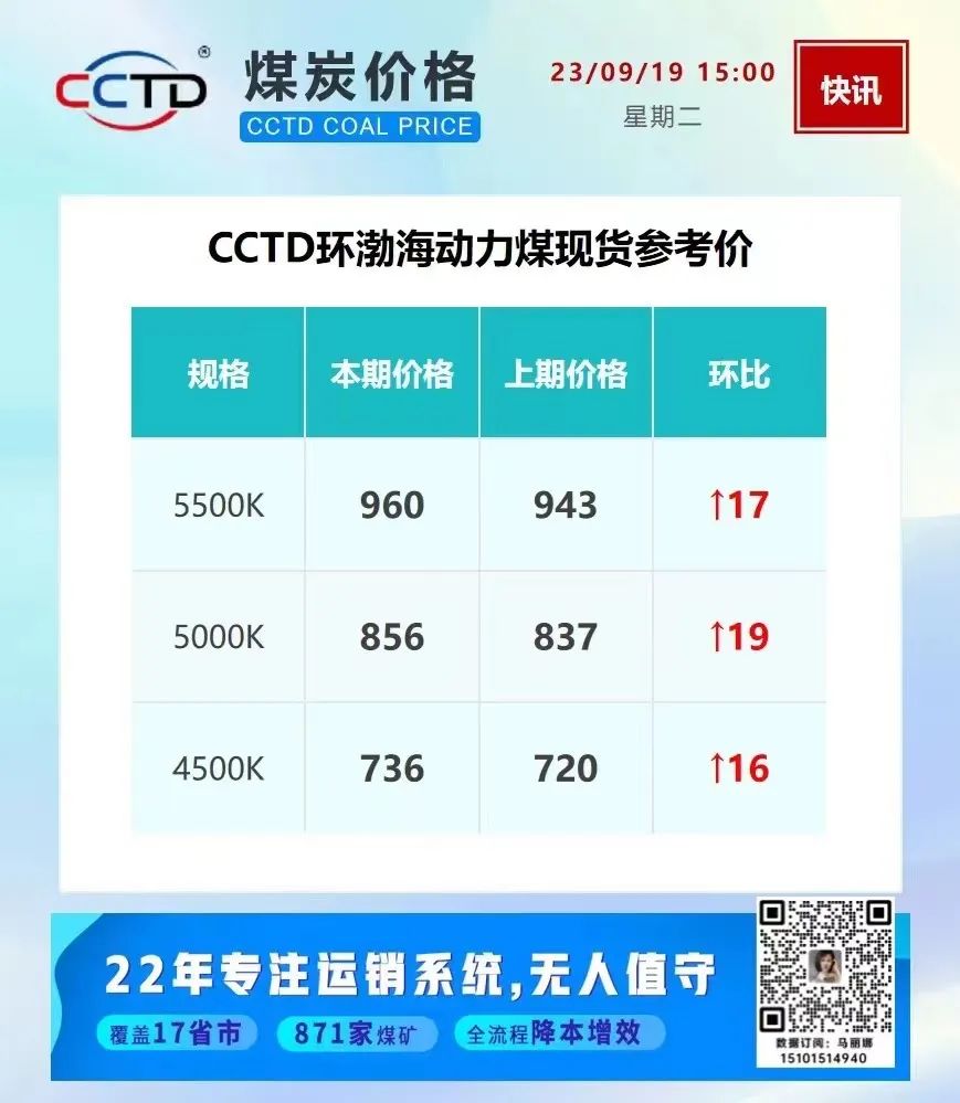 进入9月份,按往年的惯例,煤炭价格进入迎峰度夏后的回调,8月份各大机构也普遍有看跌的预期。但出乎意料的是,煤炭市场演绎了淡季上涨行情。9月14日,国家统计局监测的9月上旬数据显示,全国平均煤炭价格整体在上行,9月上旬山西优混(5500大卡)达到862.7元/吨,较8月下旬上涨5.2%。截至9月19日CCTD 5500大卡环渤海动力煤指数收报960元/吨,月环比上涨152元/吨。
