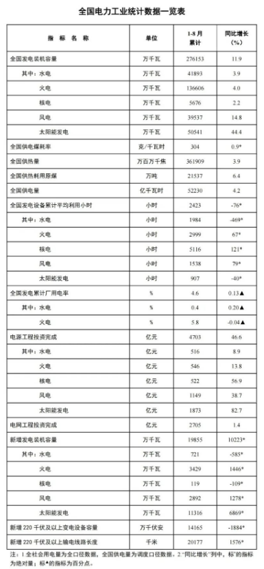 近日,国家能源局发布1-8月份全国电力工业统计数据。
