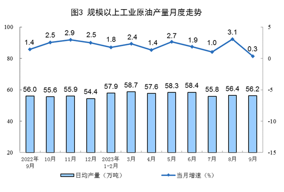 原油生产平稳增长,进口较快增长。9月份,生产原油1687万吨,同比增长0.3%,增速比8月份放缓2.8个百分点,日均产量56.2万吨。进口原油4574万吨,同比增长13.7%,增速比8月份回落17.2个百分点。