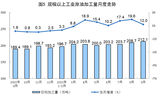 原油加工保持较快增长。9月份,加工原油6362万吨,同比增长12.0%,增速比8月份回落7.6个百分点,日均加工原油212.1万吨。1—9月份,加工原油55484万吨,同比增长11.5%。