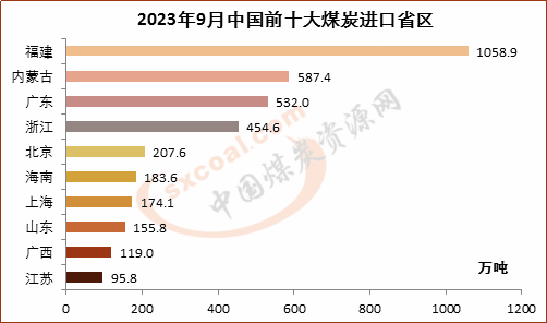 今年9月份,福建、内蒙古、广东、浙江和北京为当月进口量前五大省区,合计进口煤炭2840.5万吨,同比增长33.96%,环比下降3.72%,占全国进口煤总量的67.4%,高于前一月的66.5%。
