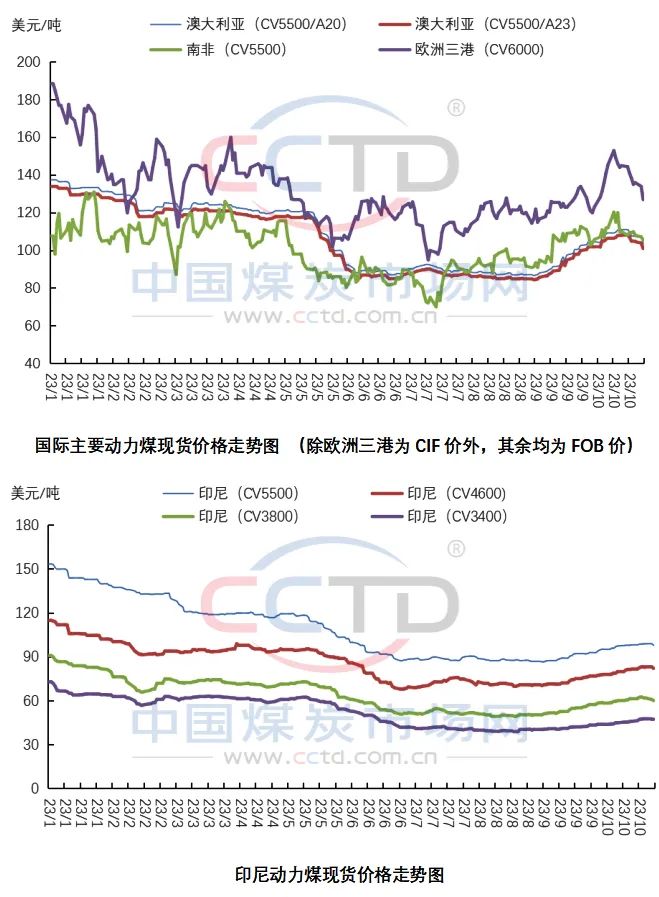 10月份,国际动力煤价格月环比涨跌互现。受巴以冲突影响,欧洲、南非动力煤价格短暂上涨后开始下行,澳大利亚动力煤价格短时上行后呈现小幅回调态势。印尼各热值动力煤价格则在供弱需强的推动下有所上行。
