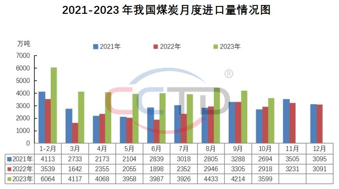海关总署发布的最新数据显示,2023年10月份,我国进口煤炭3599.2万吨,较去年同期的2918.2万吨增加681万吨,增长23.3%;较今年9月份的4214万吨减少614.8万吨,下降14.6%。今年1-10月份,我国共进口煤炭38364万吨,同比增长66.8%。从数据可以看出,10月进口量月环比明显减少,但同比依然保持上涨态势。