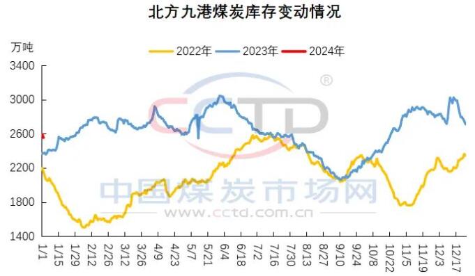 元旦假期期间,北方九港已降至2500万吨左右,去库接近30万吨。距离春节还有1个月左右时间,为降低风险,贸易商发运积极性或较低,北港调入量或受限,同时,近期锚地船舶数量仍较为可观,预计1月上、中旬,北港库存将持续去化。
