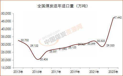 在月度进口量屡创新高的情况下,2023年全年煤炭进口量同样创下了历史新高,达47441.6万吨,同比大增61.8%。在此之前,国内煤炭进口最高历史记录是2013年创下的32702万吨。
