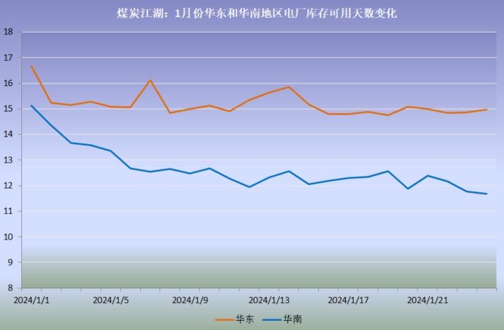 近期虽然国内经历了新一轮的寒流袭击,但影响较为短暂,本周下半周国内气温逐渐回升到常年同期的正常水平。据煤炭江湖统计数据显示,电厂在长协和进口煤的支撑下,库存继续保持在安全水平,华东和华南地区电厂的存煤可用天数基本保持平稳。此外,从本周末开始制造业、建筑业等工业行业将陆续放假,工业用电需求减弱,终端煤耗将出现回落。