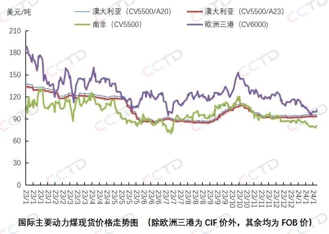2024年1月份,国际动力煤价格月环比延续了2023年12月的态势,依然以降为主。欧洲地区耗煤需求低迷,欧洲三港和南非动力煤价格月环比继续下行;中国终端用户询货积极性虽有提升,但终端库存高位限制了实际补库需求,叠加印度采购需求仍显疲态,印尼动力煤价格月环比小幅下调;澳大利亚动力煤价格在供应偏紧的支撑下月环比小幅上调。