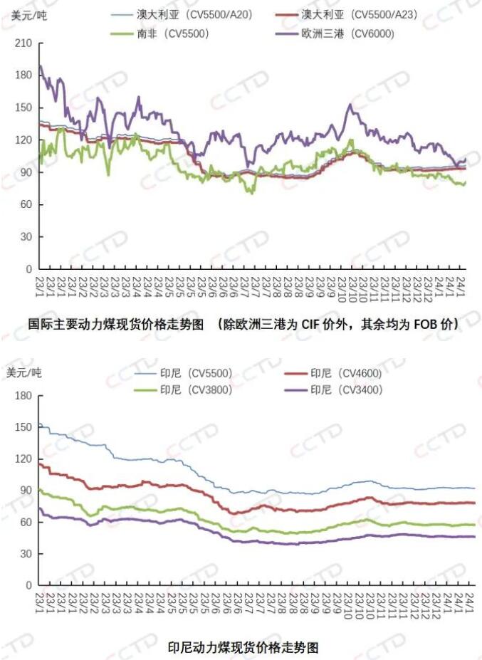2024年1月份,国际动力煤价格月环比延续了2023年12月的态势,依然以降为主。欧洲地区耗煤需求低迷,欧洲三港和南非动力煤价格月环比继续下行;中国终端用户询货积极性虽有提升,但终端库存高位限制了实际补库需求,叠加印度采购需求仍显疲态,印尼动力煤价格月环比小幅下调;澳大利亚动力煤价格在供应偏紧的支撑下月环比小幅上调。
