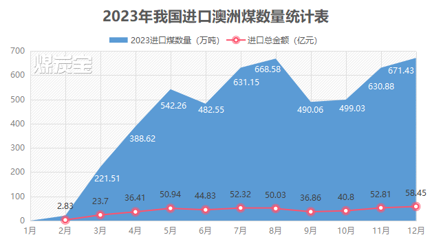 从2023年2月份正式恢复进口澳洲煤以来,进口数量和金额逐渐攀升。在煤炭宝提供的2023年进口澳洲煤数量统计图中,2月份进口澳洲煤20.72万吨,金额仅为2.83亿元,3月份则上升至221.51万吨,最终在2023年12月份进口澳大利亚煤炭数量创下当年进口最高峰,达到671.43万吨,进口金额也高达58.45亿元。
