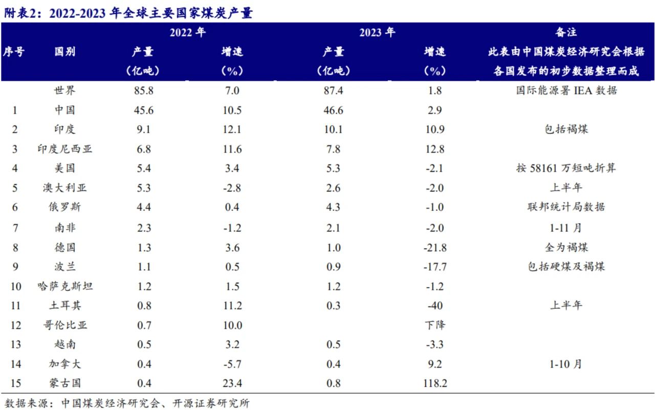 煤炭产量方面,2023年我国规上工业原煤产量46.6亿吨,创历史新高,较2022年增长2.9%,增速较2022年有所回落。2023年全球煤炭产量预计87.4亿吨,同比增长1.8%,全球煤炭扩产速度较2022年亦出现明显放缓。