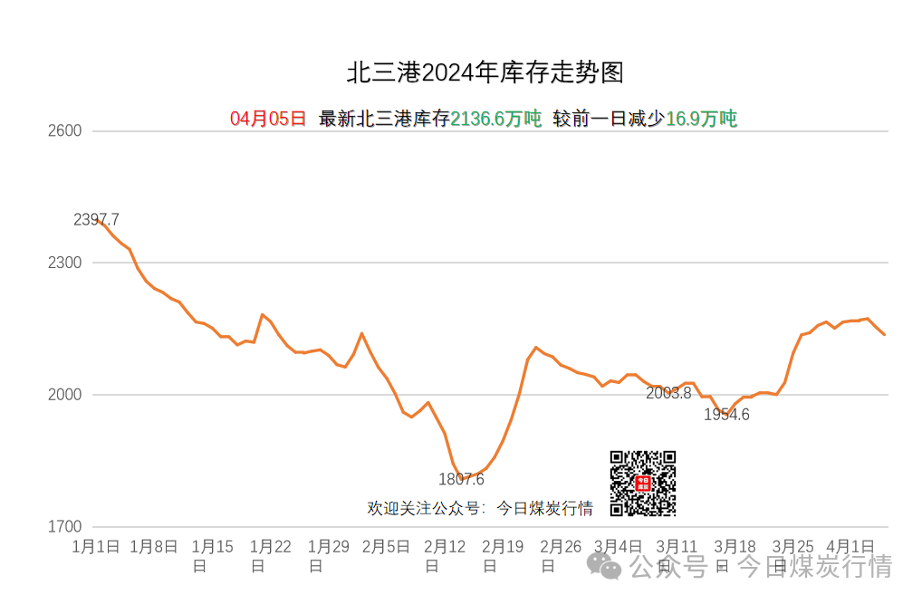 据今日煤炭行情了解:04月05日最新北三港库存2136.6万吨 较前一日减少16.9万吨。北三港2024年库存如下图所示: