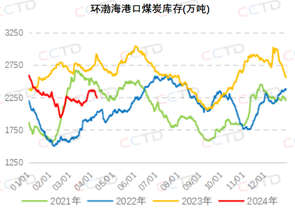 进入4月份,大秦线如期开始检修,日运量降至100万吨左右水平,调入量偏低使得近几日港口库存出现明显下降。截至4月7日,环渤海港口库存为2244.7万吨,周环比下降121.1万吨。流通环节现货供给压力减轻,市场情绪略有分化,港口价格跌幅也有所放缓。