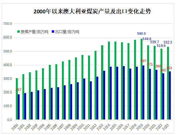 据澳大利亚联邦工业、科学和资源部首席经济师办公室(Australian government's Office of the Chief Economist -OCE)最新发布的2024年1季度《资源和能源季报》(Resources and Energy Quarterly,March 2024)数据显示, 2023年,澳大利亚原煤产量5.32亿吨,比上年同期增加1265万吨,同比增长2.4%。