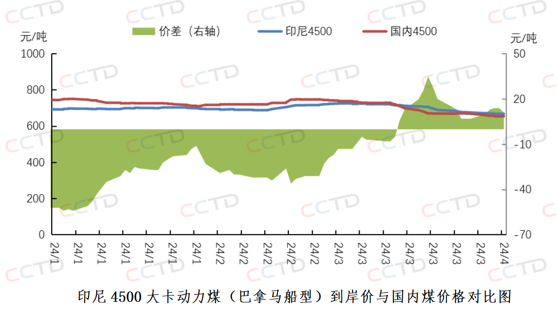 进入3月以来,进口动力煤价格持续倒挂制约了国内终端用户对进口煤的采购积极性,市场偏弱运行。以印尼4500大卡与国内4500大卡动力煤同到华南地区港口到岸价对比为例,3月以来进口印尼煤价格优势持续收窄甚至明显倒挂。(此处印尼华南地区港口到岸价中不考虑港杂费、滞期费和实际利润)。