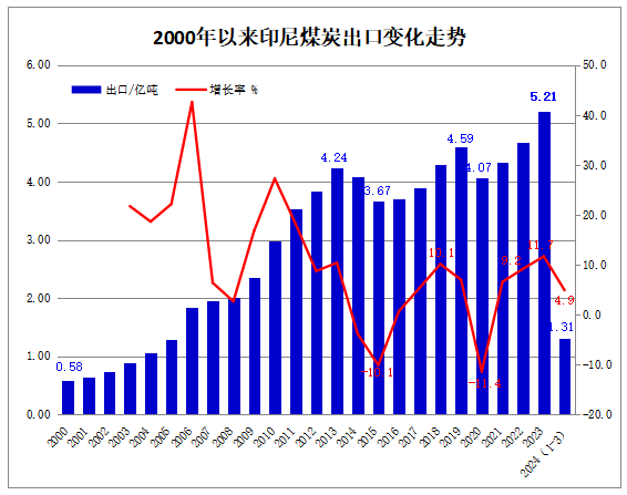 据印度尼西亚国家统计局(BPS-Statistics Indonesia)发布的统计数据显示,2024年1-3月,印尼煤炭出口量累计为13104.02万吨,比上年同期增加613.99万吨,同比增长4.92%。