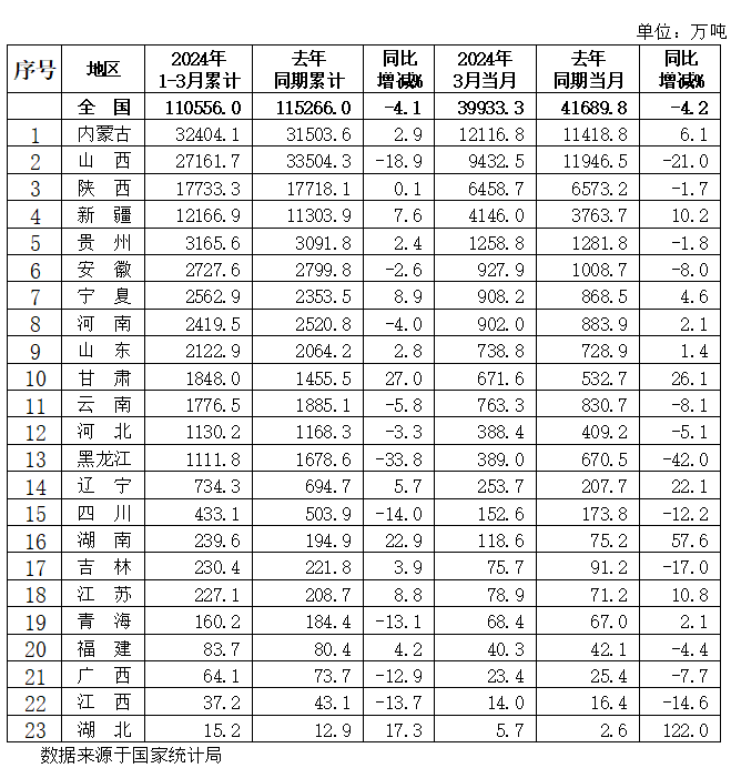2024年一季度全国规模以上分省区原煤产量数据发布