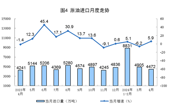 原油生产平稳增长,进口由降转增。4月份,规上工业原油产量1747万吨,同比增长1.3%,增速比3月份加快0.1个百分点;日均产量58.2万吨。进口原油4472万吨,同比增长5.9%。
