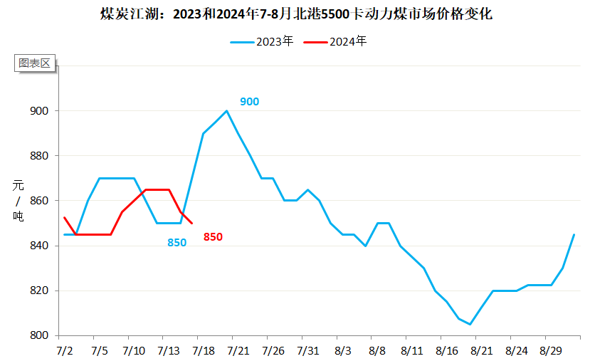 可以看到今年煤价的利空因素比去年更多,市场环境更弱,预计8月份市场复苏难度很大,预计煤价将逐渐走低。从下图可以看到,2023年北港5500卡动力煤价格在7月下旬最高的900元,一路下跌至8月底,并在接近800元的位置时才止跌,并在9月份一路反弹突破1000元。那么今年煤价会跌到什么位置止跌呢?后期是否也会突破900元,甚至突破1000元呢?我们会在下一篇文章中详细进行分析并给出明确的判断。