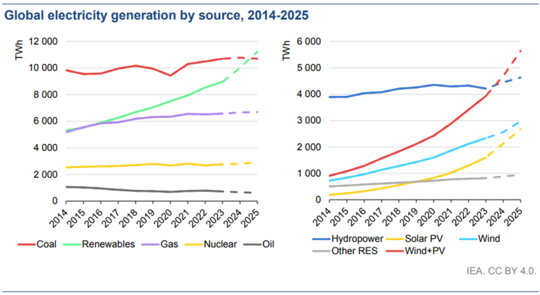 报告指出,预计包括水力、太阳能、风能等在内的可再生能源在全球电力供应中的比例将从2023年的30%攀升至2025年的35%。与此同时,全球电力供应对煤炭的依赖将减少,同期煤炭的比例将从36%降至33%。
