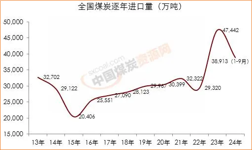 海关总署数据还显示,2024年1-9月份,全国共进口煤炭38912.8万吨,同比增长11.9%。今年前9月的进口量已经远超除2023年以外之前年份的全年进口。