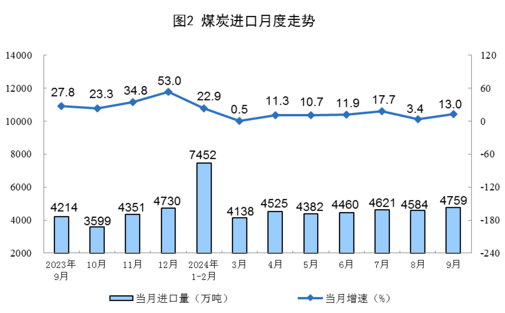 原煤生产增速加快。9月份,规上工业原煤产量4.1亿吨,同比增长4.4%,增速比8月份加快1.6个百分点;日均产量1381.5万吨。进口煤炭4759万吨,同比增长13.0%。