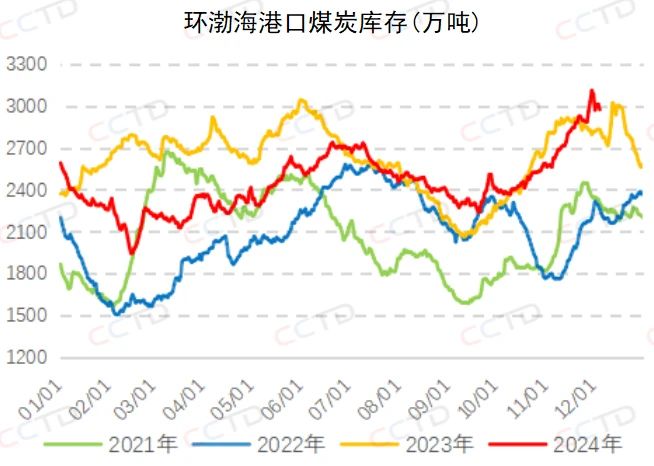 近期,沿海海域天气状况转好,各港封航时间大幅缩短,前期积压船舶陆续离港,船舶装卸效率加快,致使调出量快速升至高位,明显好于调入量,环渤海港口库存初现下滑态势。今日环渤海港口煤炭库存合计2973.4万吨,再次降至3000万吨以下。