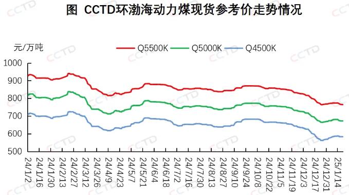 近期,港口市场现货需求疲弱,加之部分贸易商节前出货意愿增强,煤价保持小幅下调态势。1月20日,“CCTD环渤海动力煤现货参考价”5500K、5000K、4500K三个规格品价格分别收于765、672、584元/吨,日环比分别下降2、1、0元/吨,至此,当前煤价已较前期(上周初)高点分别下降9、9、4元/吨。