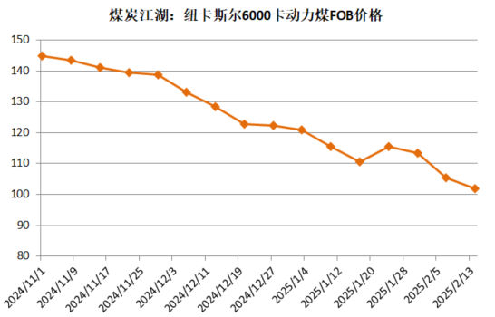 据煤炭江湖统计数据显示,截至到2月14日,纽卡斯尔6000卡动力煤报价为101.8美金,周环比下跌了3.6美金。因欧洲及日韩对高卡需求疲软,6000卡煤价近几个月来持续下跌,从去年11月至今累计跌幅已超过40美金。