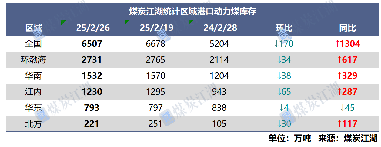 截止2月26日,全国煤炭港口库存整体数量为7232.2万吨,较上期下降166万吨,同比上升1414.7。其中动力煤库存为6507万吨,较上期下降170万吨,同比上升1304万吨。