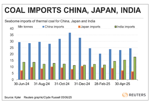 大宗商品分析机构克普勒(Kpler)的数据显示,2025年5月份,亚洲主要用于发电的燃料--动力煤海运进口量升至五个月来的最高水平,达到7412万吨,比前一个月4月份的6856万吨环比增长8.1%,但仍然低于去年5月的7830万吨,同比下降5.3%。