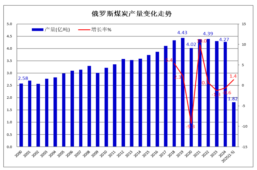 尽管俄罗斯煤炭产量仍保持基本稳定,联邦统计局数据显示,2025年前5个月,俄罗斯煤炭产量累计为1.82亿吨,比上年同期增长1.4%。其中,炼焦煤产量4315.4万吨,比上年同期下降8.5%;其它烟煤(非炼焦烟煤)8661.1万吨,同比增长4.8%;无烟煤产量为942.4万吨,同比下降0.6%;褐煤产量4287.5万吨,同比增长6.6%。