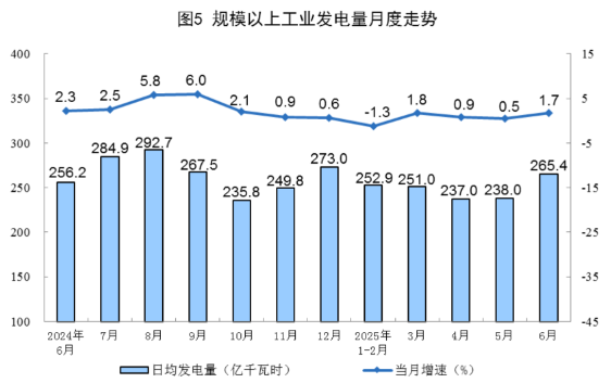 分品种看,6月份,规上工业火电、风电增速放缓,水电降幅收窄,核电、太阳能发电增速加快。其中,规上工业火电同比增长1.1%,增速比5月份放缓0.1个百分点;规上工业水电下降4.0%,降幅比5月份收窄10.3个百分点;规上工业核电增长10.3%,增速比5月份加快3.6个百分点;规上工业风电增长3.2%,增速比5月份放缓7.8个百分点;规上工业太阳能发电增长18.3%,增速比5月份加快11.0个百分点。