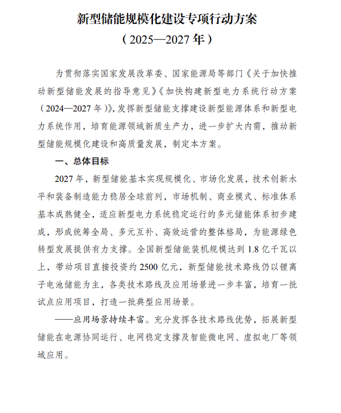 为推动新型储能高质量发展,国家发展改革委、国家能源局研究制定了《新型储能规模化建设专项行动方案(2025—2027年)》。现予印发,请结合实际认真抓好贯彻落实。